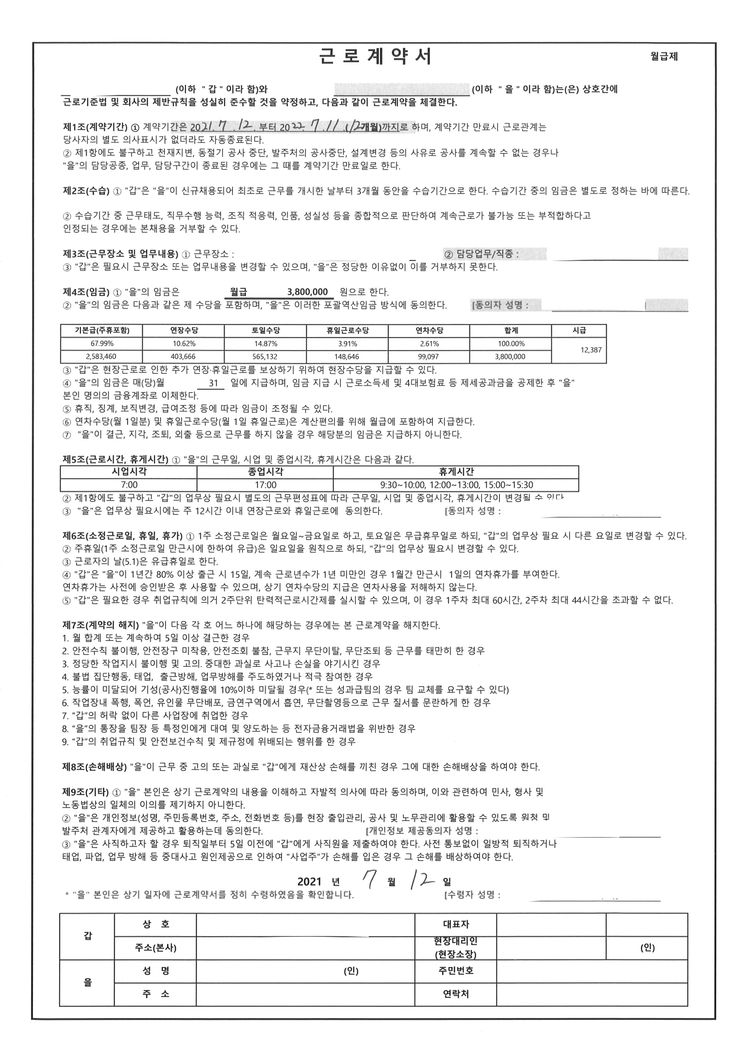 안녕하세요 본인은 21년 7월 12일 전문건설업 (철근콘크리트) 건설사 입사하여