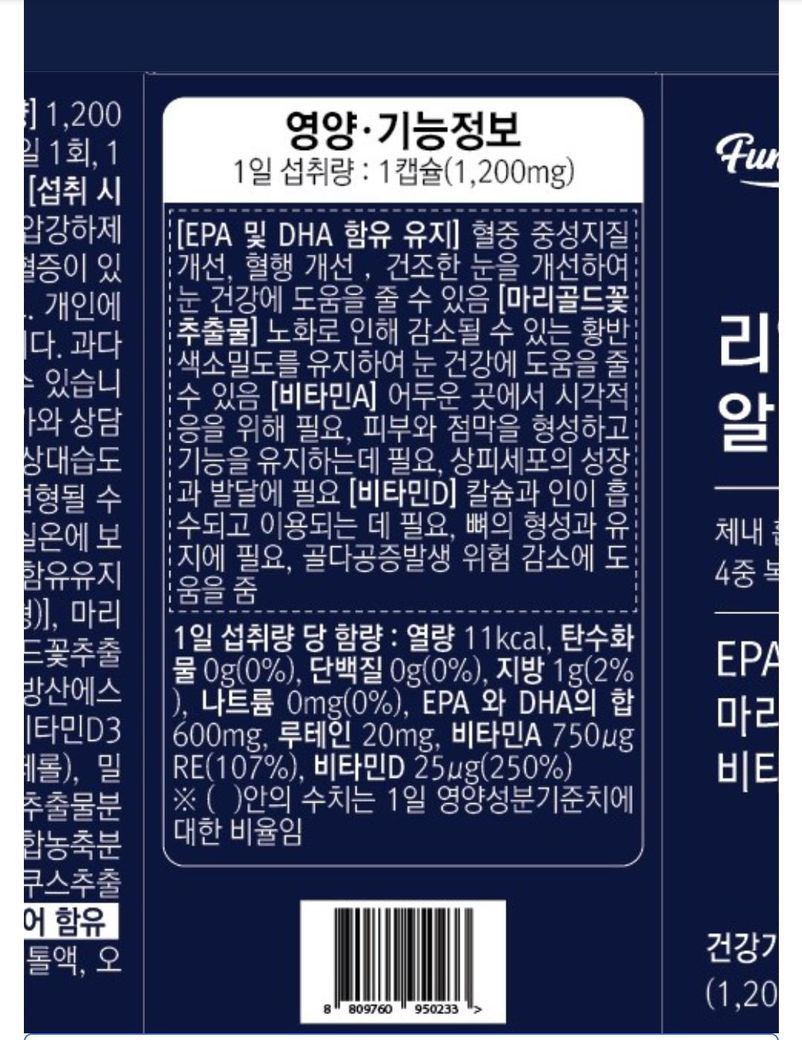한개는 퍼니트 제품인 rtg오메가3를 구입했는데 구성성분이 오메가3외에