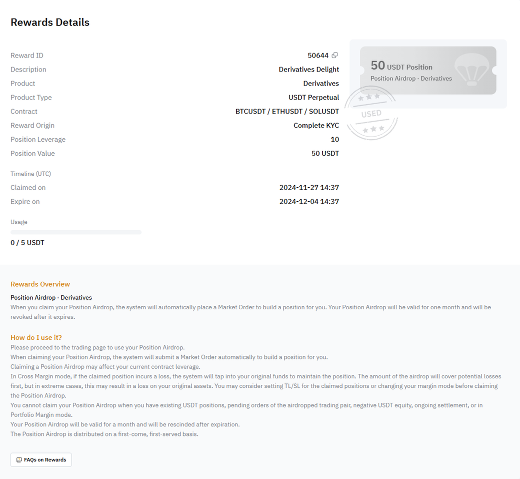바이비트에서 포지션 에어드랍이란 포지션하나를 부여하고 일부 에어드랍코인을 주면서, 포지션이 닫히면 끝나는 이벤트인데요. 손실방어용으로 50달러를 주는 것이고 사실상 큰 이벤트는 아닙니다.