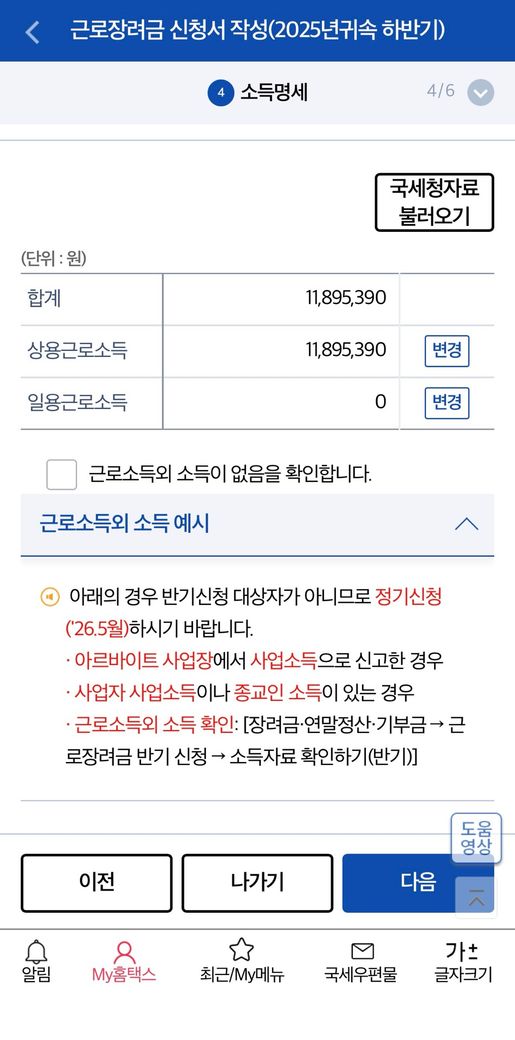 2025 소득이 대략 1100만원대인데 5월달에 신청하면 근로장려금 받을수있는걸까요? 처음에 이 화면 들어올때 소득조건 요건이 안된다는데 왜 안된다는지 모르겠네요..;;