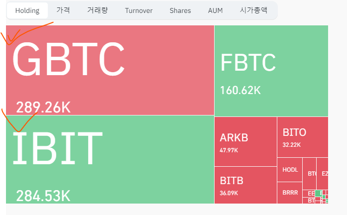 거래량으로는 블랙락의 IBIT가 가장 많습니다. 근데 자산 규모로는 그레이스케일의 GBTC가 약간 더 많습니다.