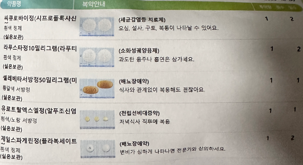 복용중이신 약 중 씨큐로바이정은 항생제로, 때때로 어지러움, 두통 등을 유발할 수 있습니다