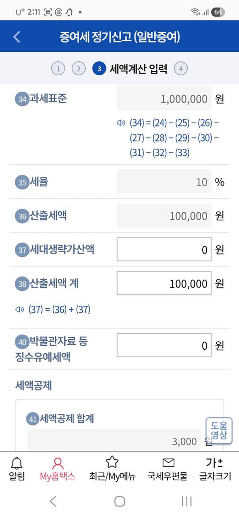 전체 내용이 다 보이지는 않지만, 과세표준이 100만원으로 되어있는 것으로 보아 증여재산공제가 적용되지 않은 신고서로 보입니다.
