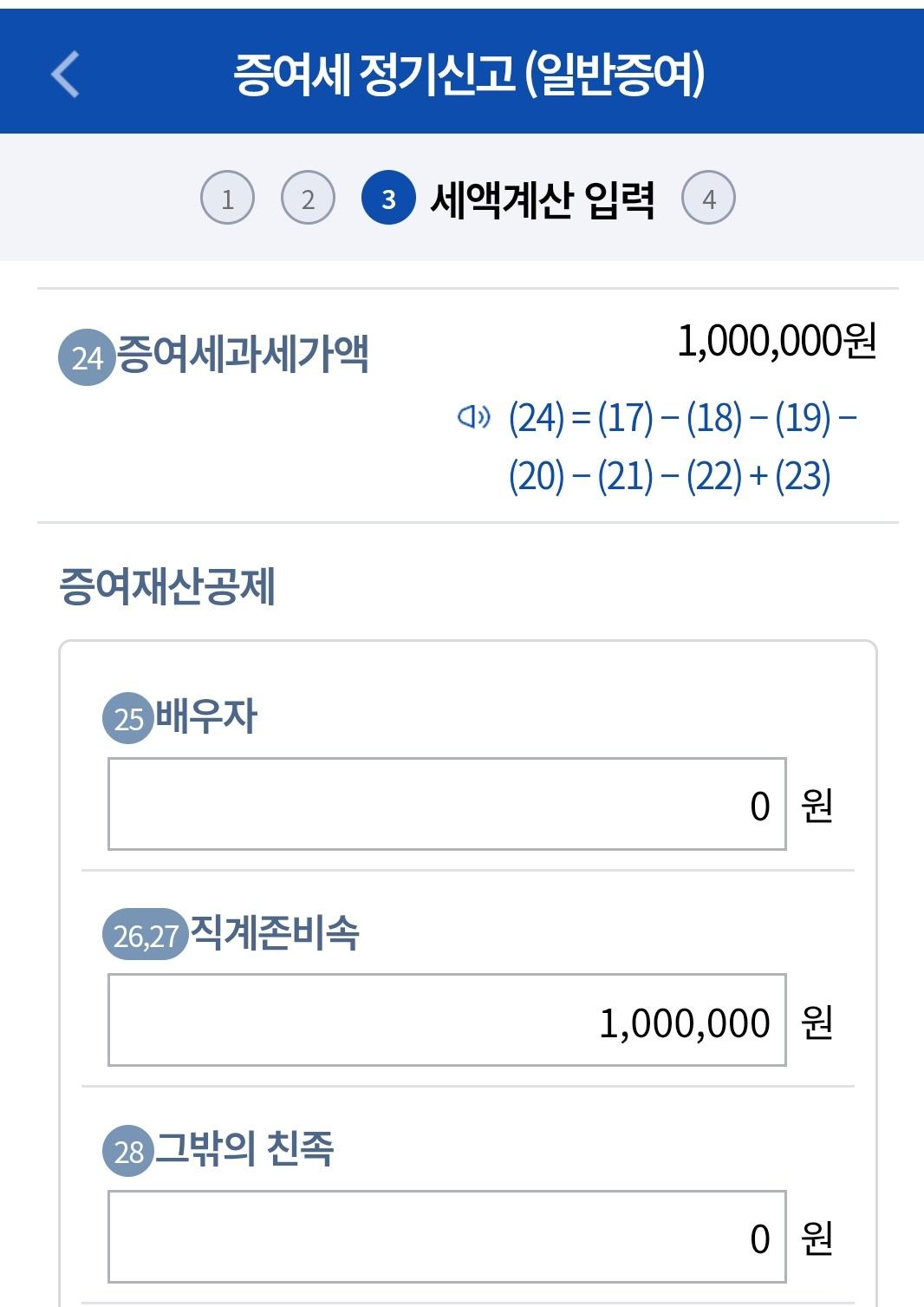 증여재산공제에 26,27 직계존비속란에 100만원 공제를 입력하셔야