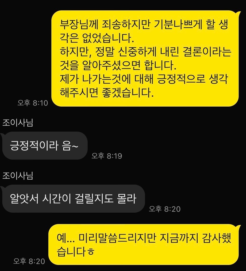 위 문자메시지 만으로는 명확한 답변을 드리기 어려우나 문맥상 사직의 의사표시를 한 것으로 해석될 수 있습니다.