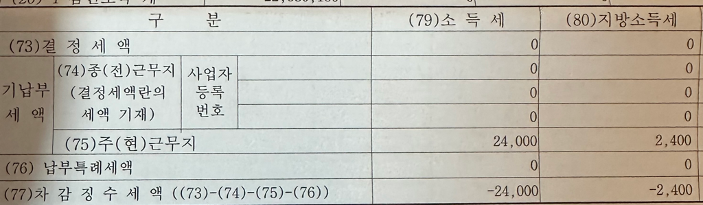 기납부세액은 매월 급여 지급 시 원천징수된 소득세의 합계이므로 받으셨던 매월의 급여명세서 상의 소득세를 합한 금액이 2.4만원이 맞는지 확인해보시면 됩니다.