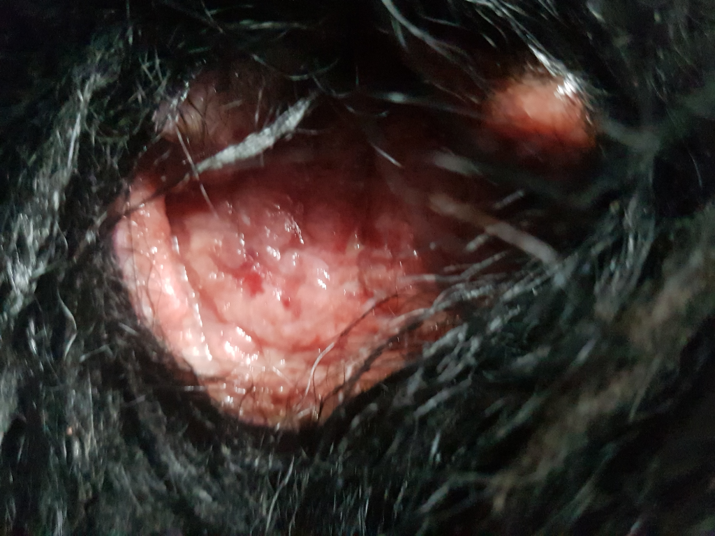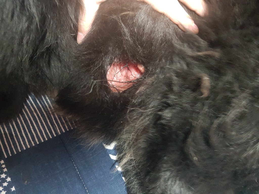 시골에서 키우는 개다보니 세심하게 관찰하지 못 했습니다. 오늘 처음 발견하고 깜짝 놀랐습니다. 이게 무슨 상처인지 궁금합니다. 튀어나오진 않고 완전 생살이 패인 것 처럼 보입니다. 계속 핥습니다.