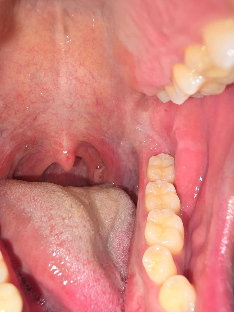 올려주신 사진만으로는 다소 제한적이나 편도염을 추정할 수 있는 편도 비대나 염증 소견은 뚜렷하지 않으므로 음주, 흡연, 카페인, 자극적 음식을 피하고 경과를 지켜보기 바랍니다.