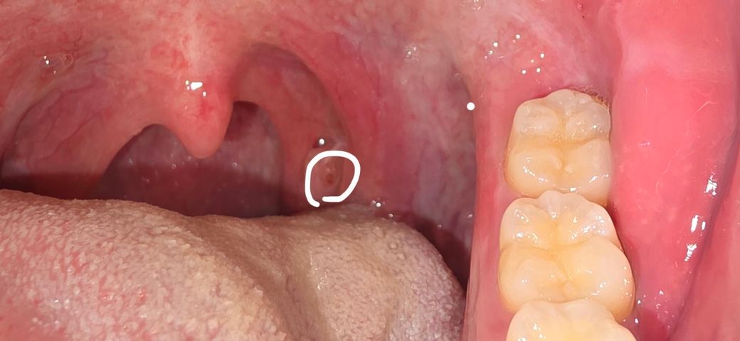 왼쪽 편도에 작은 빨간 점이 생겼습니다.