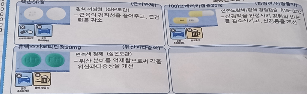 문의주신 약은 신경통약/위보호제/근육이완제로 구성되어 있습니다.