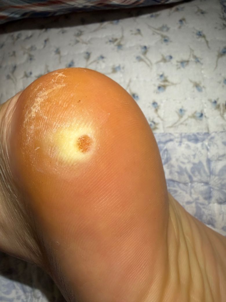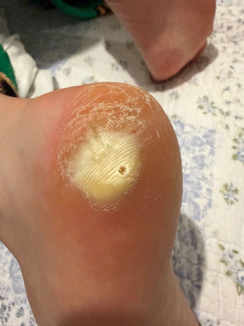 올려주신 사진에서 티눈 밴드 사용으로 인해 해당 부위의 살이 하얗게 불어 있고, 중앙에 깊은 구멍이 생긴 상태로 보이므로 현재 상태에서 티눈 밴드 사용을 즉시 중단하기 바랍니다.