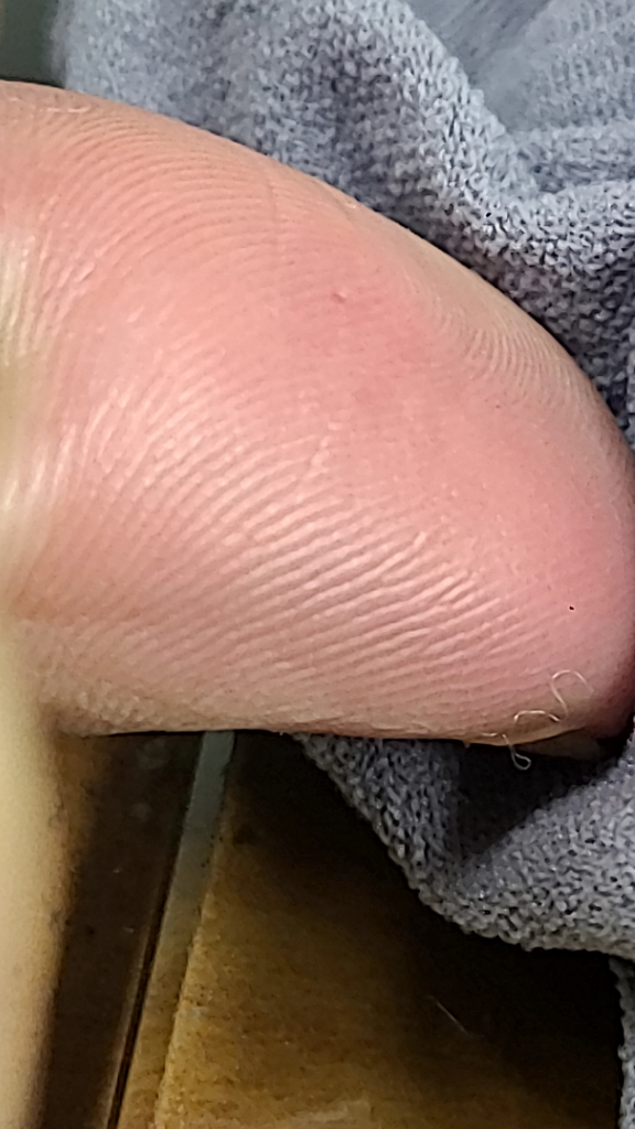 딱히 특정한 피부 질환을 의심할만한 소견으로 보이지 않습니다. 한포진 및 티눈은 확실히 아니며, 모르는 사이에 작은 이물이 박혔거나 뾰족한 것에 찔린 것은 아닌지 의심스럽습니다.