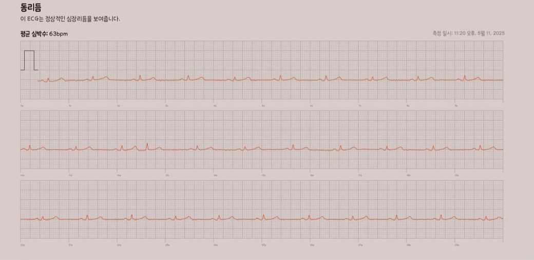 올려주신 심전도에서는 정상동율동리듬, 즉 정상적인 심전도 양상을 보입니다. 하지만 워치 심전도의 경우 정확성이 떨어지기 때문에 참고용으로만 사용하시는 것이 좋습니다.