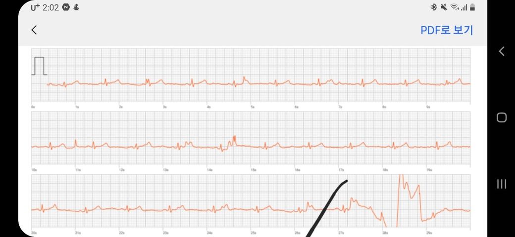 갤럭시워치4로 심전도 검사한 건데 결과가 심방세동이 나왔어요. 검은색 선 뒤에 부분에서 대고있던 손가락이 잠시 흔들려서 그런 것 같은데 맞나요? 아니면 검