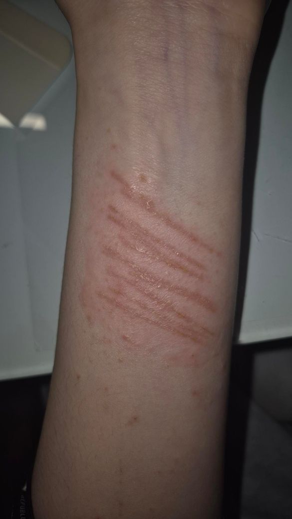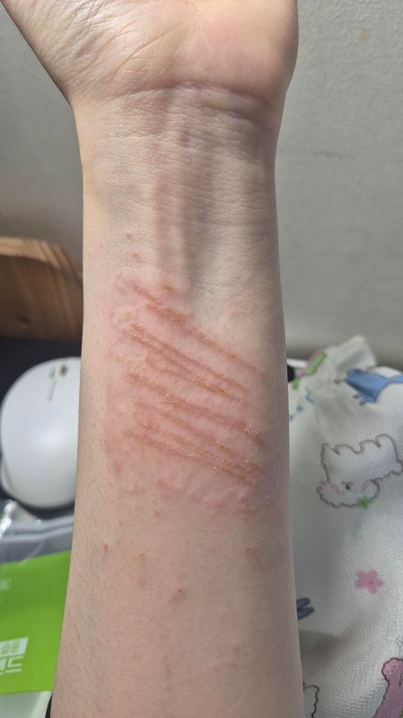 어제도 말씀드렸지만, 사진상으로는 현재 12일째 치유 과정으로 보이는 얕은 선상 찰과상 또는 표재성 열상 후 상태에 가깝고, 뚜렷한 고름, 퍼지는 심한 홍반, 심한 부종은 두드러지지 않아 보입니다. 즉, 지금 단계에서 “감염이 강하게 의심되는 상처”로 보이진 않습니다. 다만 여러 줄의 평행한 선상 상처라서 상처 하나하나가 얕더라도, 전체적으로는 붉은 자국이 한동안 남을 가능성은 있습니다. 상처가 아직 완전히 성숙한 흉터 단계는 아니고, 현재는 염증 후 홍반과 초기 흉터 형성이 섞여 있는 시기로 보는 것이 더 적절합니다. 상처 치유는 지혈, 염증, 증식, 재형성 단계를 거치며, 흉터의 최종 모양은 보통 수개월에 걸쳐 서서히 정해집니다.