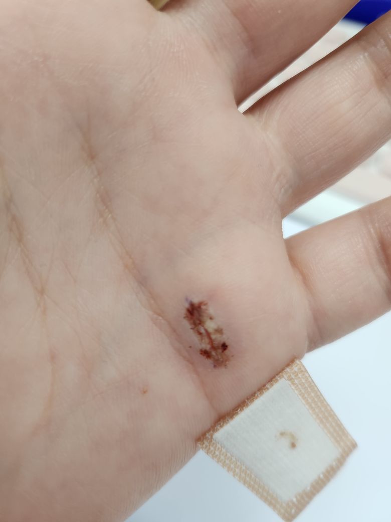 현재 사진상으로는 발적이나 부종은 잘 보이지 않지만 통증과 열감, 그리고 냄새가 상처부위에서 난다면 2차 세균감염 가능성이 있으므로 내원하시어 진료를 먼저 받아보시는 것이 좋겠습니다.