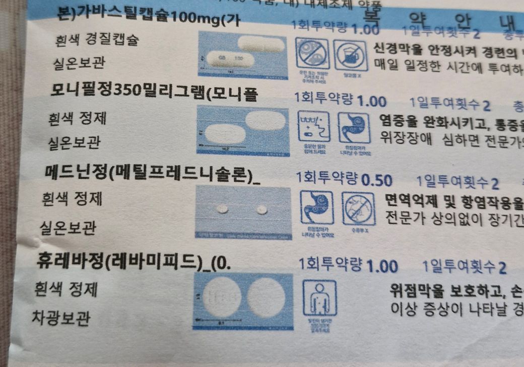 처방받으신 약들에 모니필정이라는 소염진통제가 이미 들어있기 때문에, 추가적으로 진통제를 복용하신다면 타이레놀과 같이 아세트아미노펜 성분으로 되어있는 진통제를 복용하시는 것을 추천드립니다
