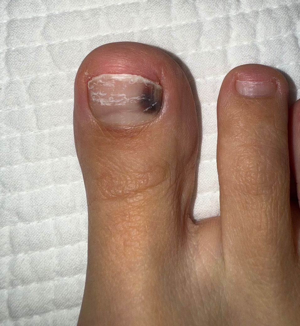 올려주신 사진으로 미루어 무좀 보다는 외부 충격으로 생긴 발톱 밑 조직의 출혈 가능성이 생각되며 언급하신 것과 같이 젤페디로 인해 감춰졌을 것 같습니다.