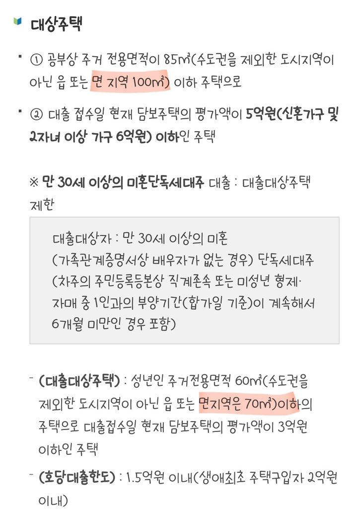 대출조건 중 만 30세이상 미혼일 때와 민법상 성년인 세대주는 차이가 있다는 것인데요. 만 30세 이상 미혼자의 경우엔, 읍 면 지역에서는 주거전용 면적이 70제곱미터 이하일 때 가능하고, 민법상 성년인 세대주는 그보다 면적이 큰 100제곱미터 이하에서 가능하다는 것이에요. 아무래도 기혼자와 미혼자가 사는 주거공간 크기가 다르기 때문에 생긴 규정이지요.