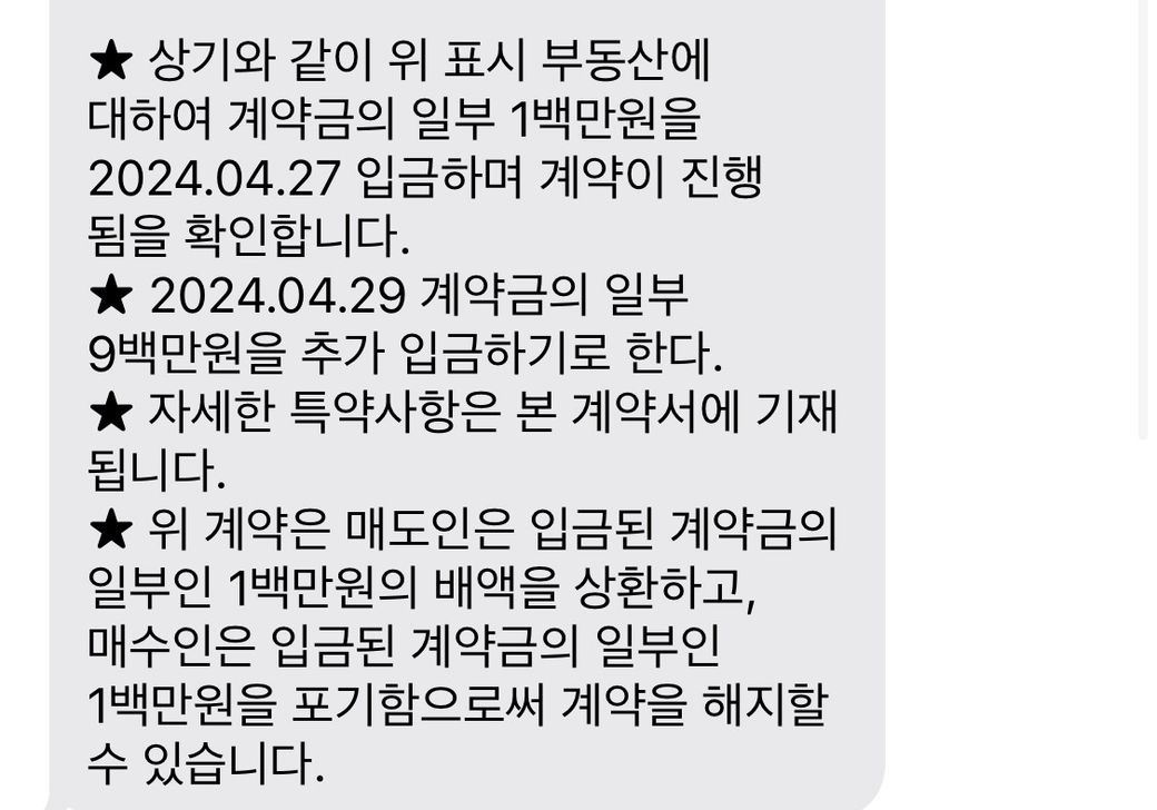 문자 내용을 보면 해당 계약의 위약금을 계약금의 일부인 100만원으로 표시하였으니