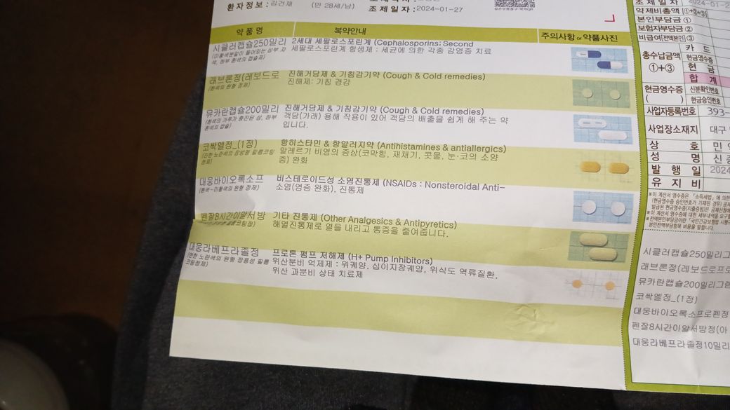 시클러캡슐250밀리그램, 래브론정, 뮤카란캡슐, 코싹엘정, 대웅바이오록소프로펜정, 펜잘8시간이알서방정, 대웅라베프라졸정을 처방받았는데요
