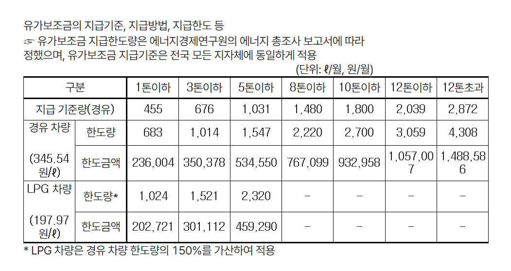 유가보조금의 경우 다음의 표를 첨부해 드리겠습니다