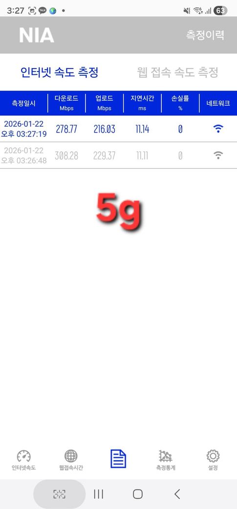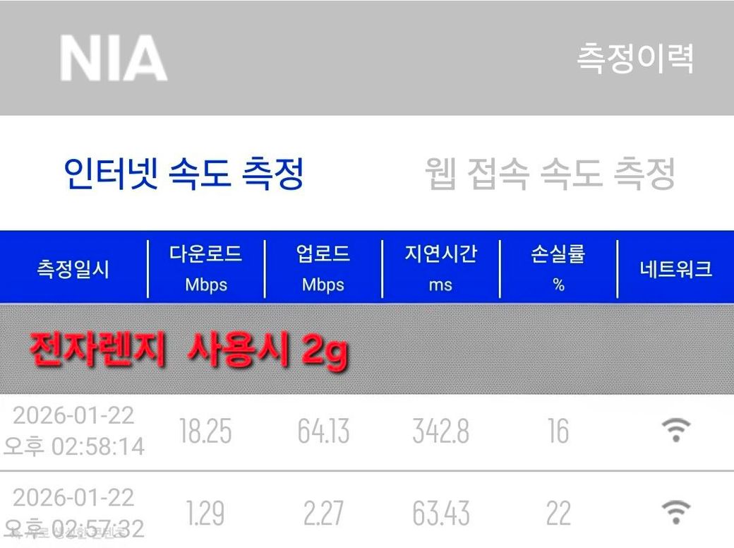 2.4GHz 대역은 전자레인지와 주파수가 겹쳐서 간섭이 심합니다. 손실률 16~22%는 매우 심각한 수준으로, 연결 끊김이나 속도 저하가 발생할수 있습니다. 5GHz대역은 전자레인지 간섭이 거의 없고, 속도도 훨씬 빠릅니다. 레드님이 측정하신 업로드는 KT와이파이 기준으로 매우 괜찮은 속도입니다. 11~15ms는 온라인 게임, 영상통화에도 안정적인 수준입니다.