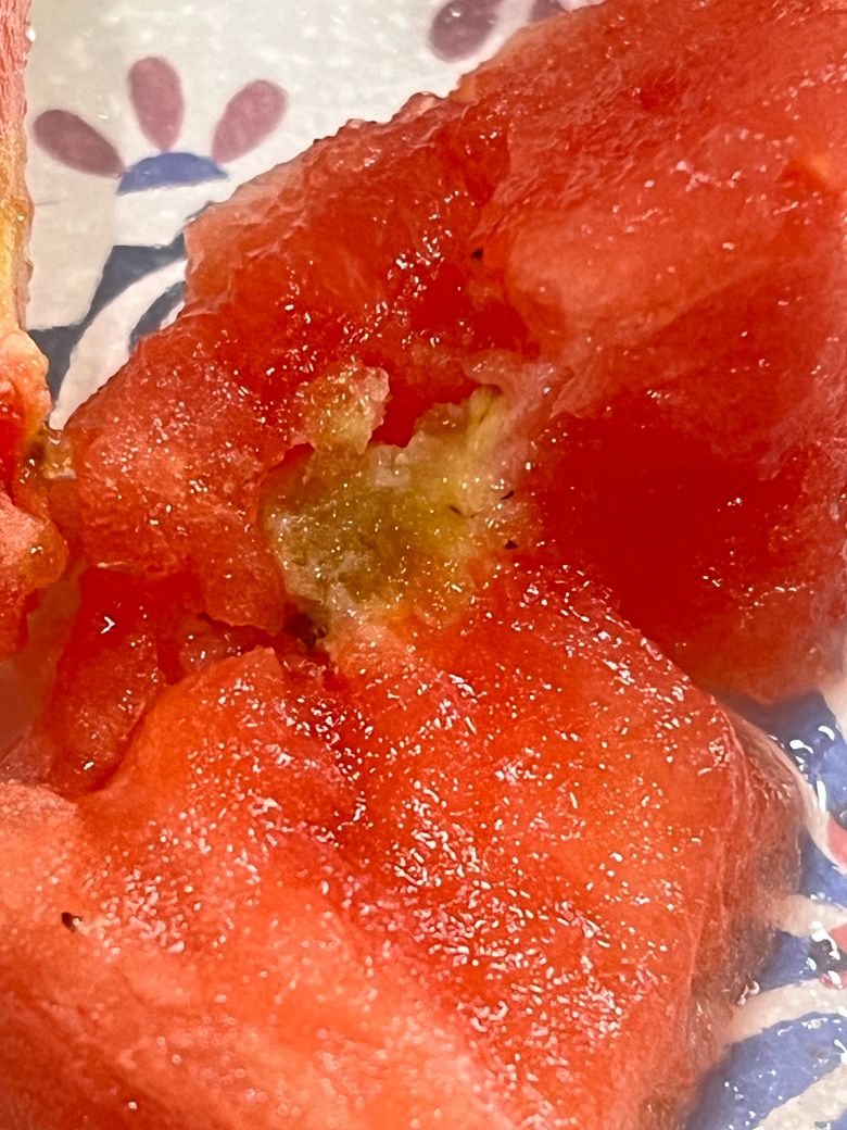 보통 저런 딱딱하게 변화하는 부분이 생길정도로 숙성된 수박은 그당도가 최고조에 올라가기 때문에 맛은 좋을것이라 생각합니다.