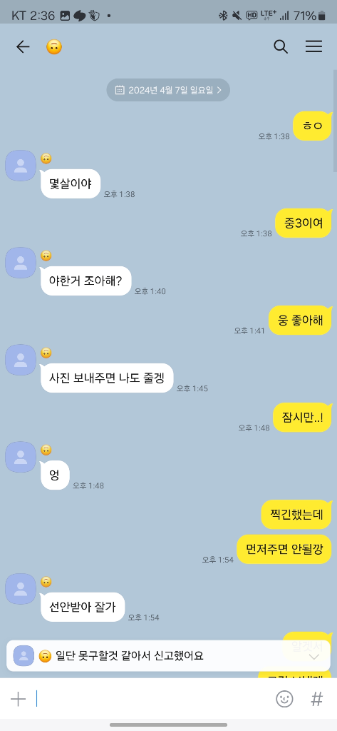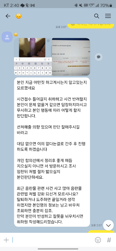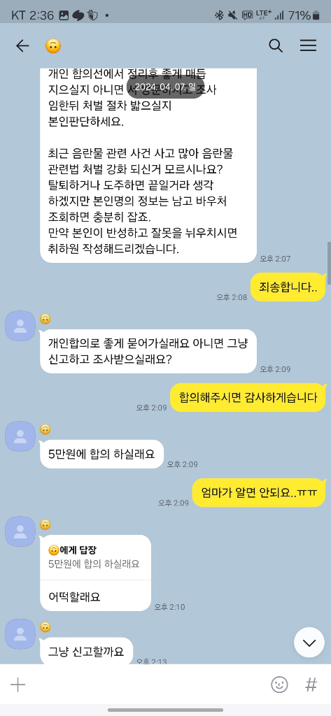 - 최근 유행하는 수법 중 하나로 고소한다고 하며 합의금을 갈취하는 것으로 실제로 고소하는 사례는 거의 없습니다. 관련 대화 내용만 보관해 주시기 바랍니다