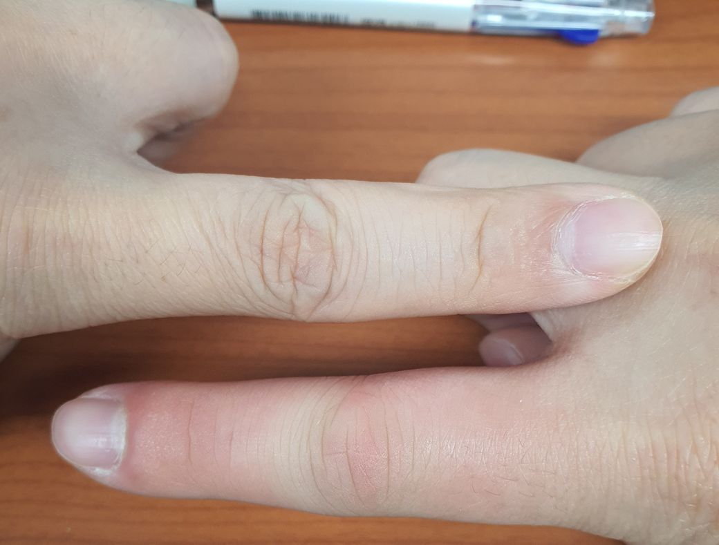 보기에도 손가락 연조직염의 모습을 보이는 상태로 손가락 하나만 발생하여