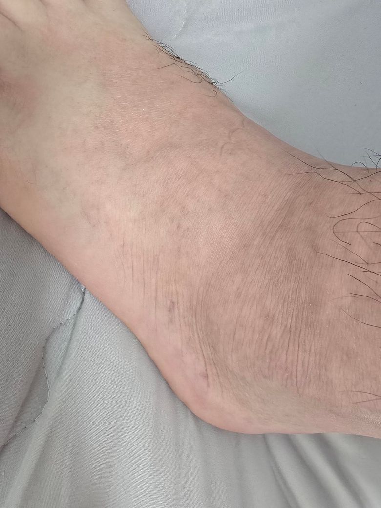 전거비인대 완전 파열 비수술치료중이고 현재 최초 다쳤던 시기로부터 약 8개월정도 지났습니다 살짝 삐끗했고(옆쪽으로 꺽임) 바로 반대다리로 중심을 옮겨서 당장 걷거나 눌렀을 때 통증은 없습니다 방금 확인했을때 복숭아뼈도 정상적으로 보이고(붓기없는상태) 언제 생긴지는 모르겠지만 사진에 보이듯이 약간 멍? 같은 게 있습니다 재파열인가요..? 정상적인 발목이랑은 다르지만 발목을 돌렸을때 통증은 없고, 복숭아뼈주변으로 눌러도 통증은 없습니다. 멍같은거는 언제 생긴지 모르겠어요