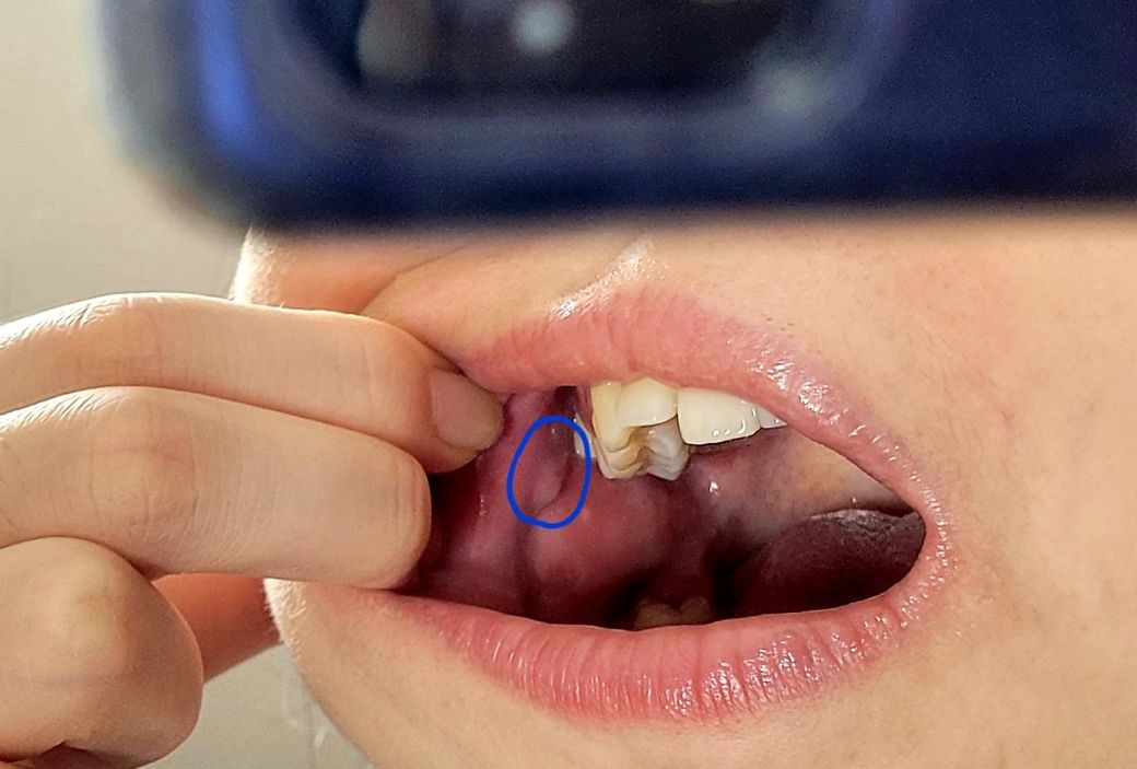 점액낭종의 가능성이 높아보이지만 사진상 해부학적 상태보다 윗쪽으로 들려서 찍혀있어 판단하기 애매합니다. 만약 반대쪽에도 비슷한 형태가 존재한다면 이는 이하선(parotid gland)이 입안으로 분비되는 개구부인 스텐슨관(Stensen's duct)의 가능성 또한 있습니다.