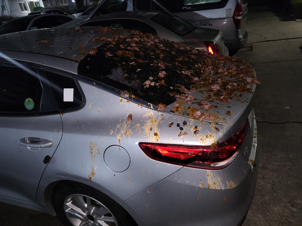 102동 아파트 흰색 주차칸 안에 며칠동안 주차를 했습니다 차 후방쪽에 있는 나무가지가 인도를 넘어 주차칸까지 뻗어있었고 그 위에 있는 감나무열매를 새들이 쪼아먹고 흔들어 제 차 위에 떨어졌습니다