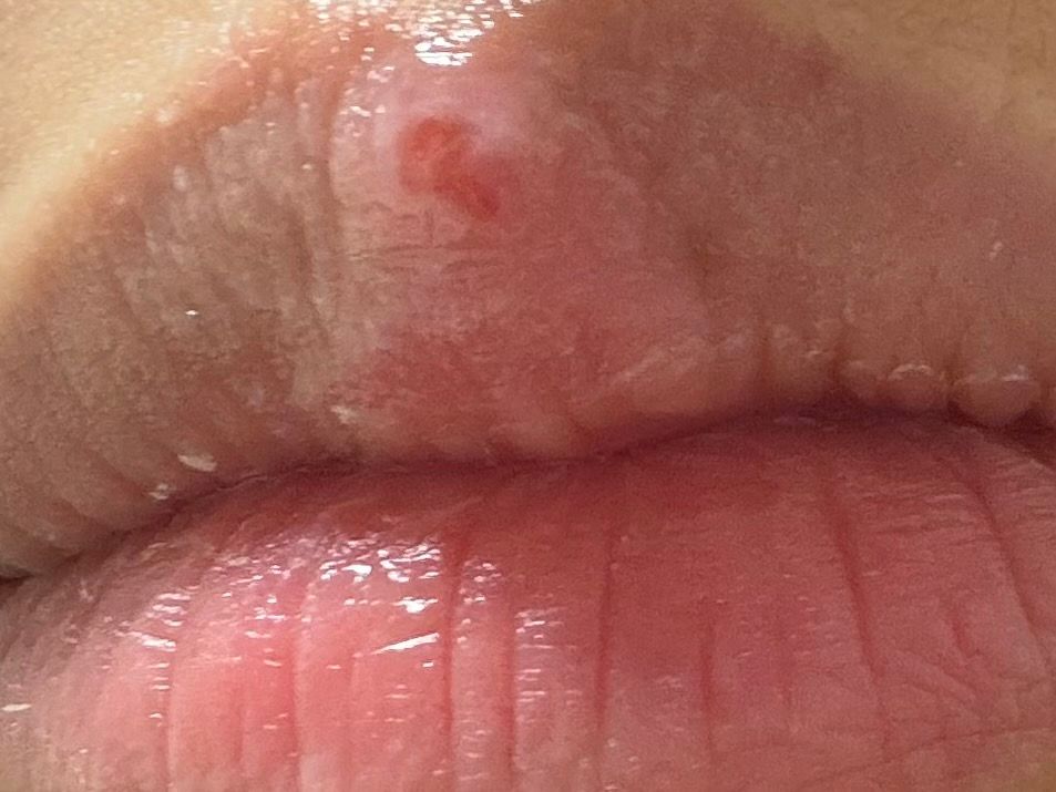 첫째, 단순포진 후 미란 단계. 보통 초기 따끔거림이나 화끈거림 후 작은 물집이 생기고, 이후 터지면서 현재처럼 보입니다.