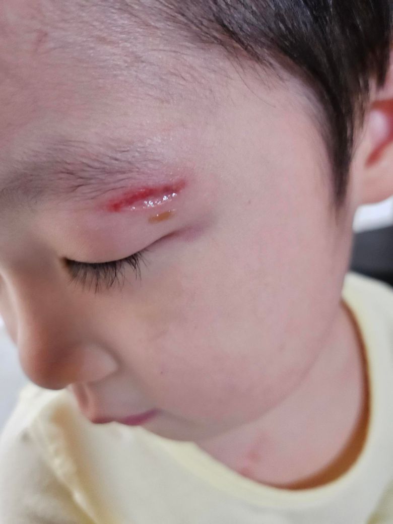 사진상 눈썹 아래쪽 눈꺼풀 피부가 열상으로 벌어졌고, 주변에 연부조직 부종과 피하출혈로 보이는 자색 멍이 동반되어 있습니다. 4세 소아에서 눈 주위는 혈관이 풍부해 비교적 가벼운 손상에도 붓기와 멍이 빠르게 진행될 수 있습니다.