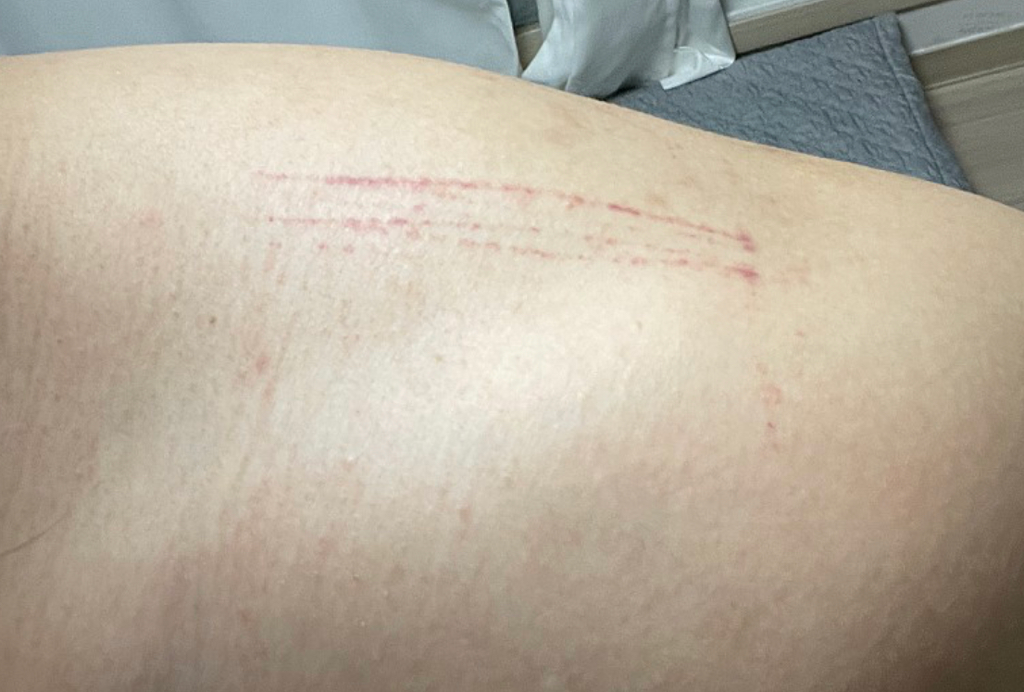 피부자극에 의해서 나타난 반응일뿐입니다. 약한 찰과상인데 혈전이랑 전혀 관련은 없습니다.