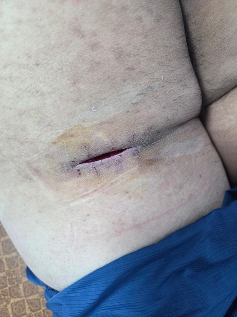 사진상 봉합 부위가 일부 벌어진 것이 맞습니다. 엉덩이 부위는 땀·습기·장력 때문에 상처가 쉽게 벌어지는 부위라 흔히 생기는 상황입니다.