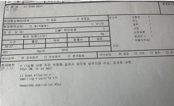 반대편 오른쪽 다리에 맥이 풀리면서 앞으로 그대로 자빠졌어요. 무릎에 시퍼런 멍이 보이고 걷을 때 너무 아파서택시 불러서 응급실로 가보니 무릎(left)에 금이 생겼다고 바로 핀으로 고정하는 수술을 받은 상황입니다.