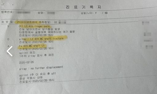 넘어져지면서 손으로 바닥을 짚었는데, 손가락 뼈에 미세한 금(골절)이 생겼다고 하더라구요.