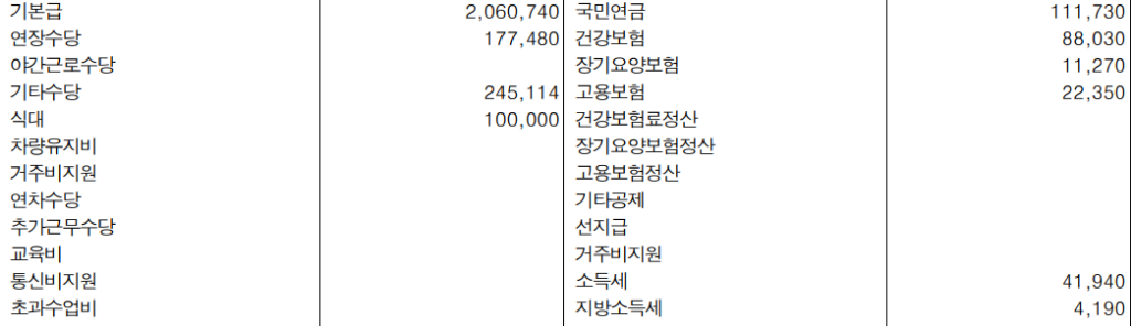 첨부하신 급여명세서에 따르면 세전 월급은 대략 258만원으로 12개월을 곱하면 연봉은 3,100만원 정도가 나옵니다. 근로계약서를 확인해야 할 필요가 있습니다.