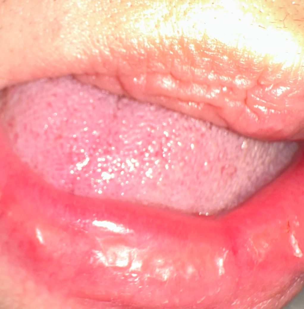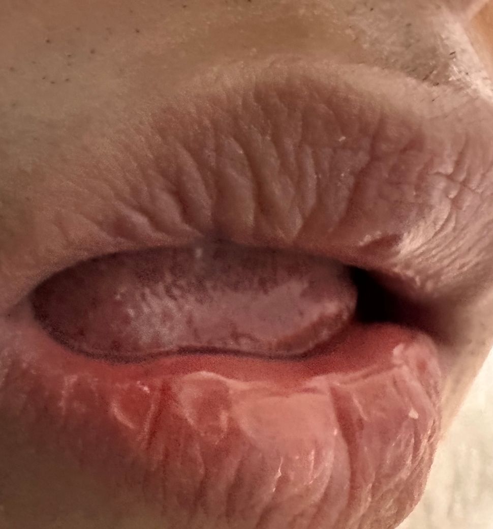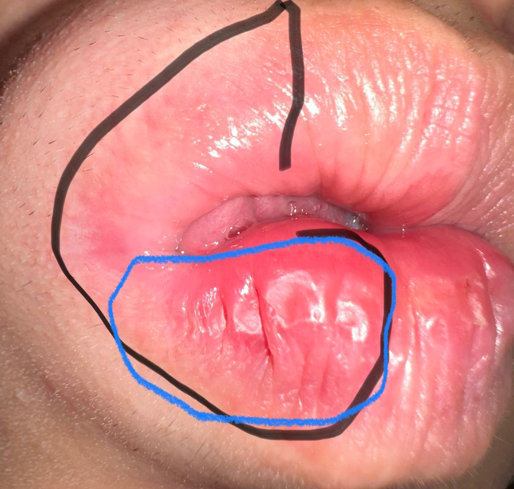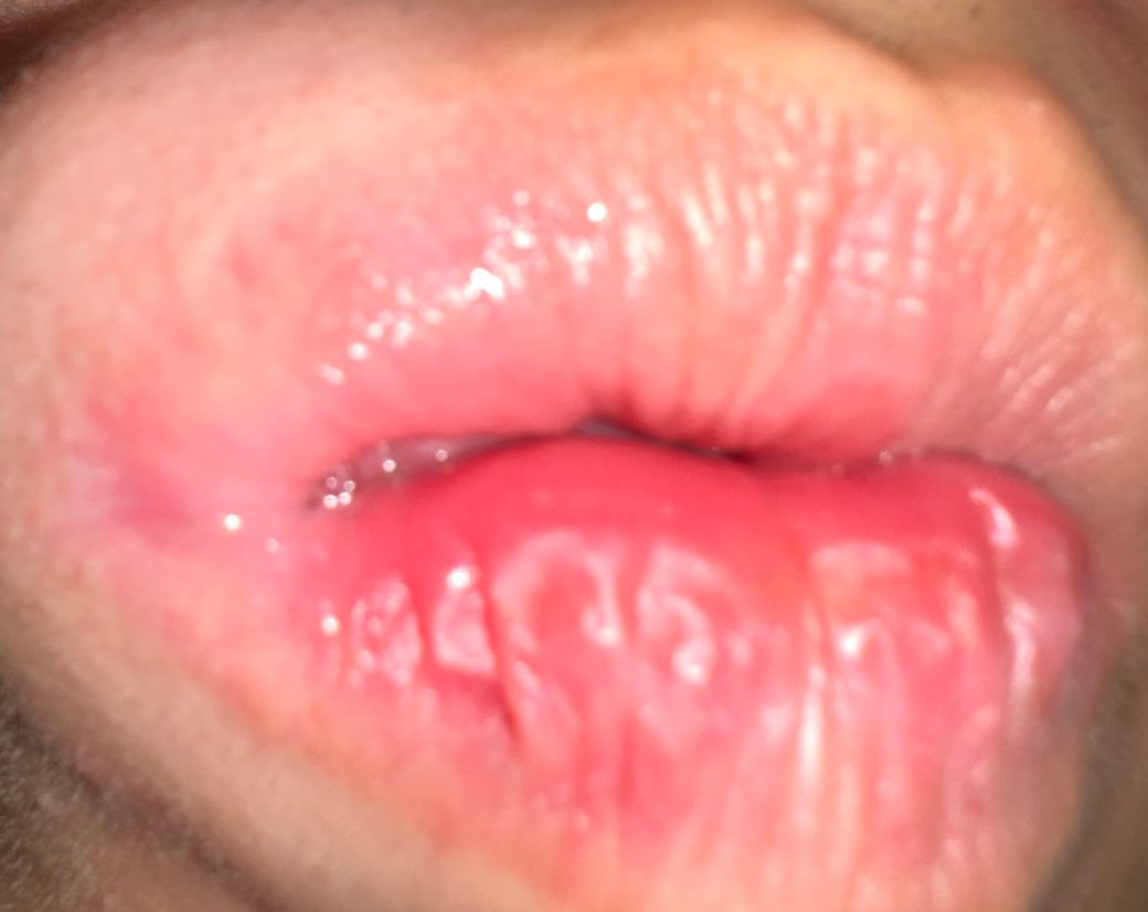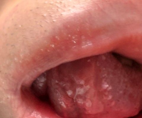 아래 입술은 튼 상황이며 윗 입술은 각질이 일어난건지 염증인지 모를 증세가 있습니다( 침을 뭍이 윗 입술 해당 부분이 사라지고 안 보입니다)