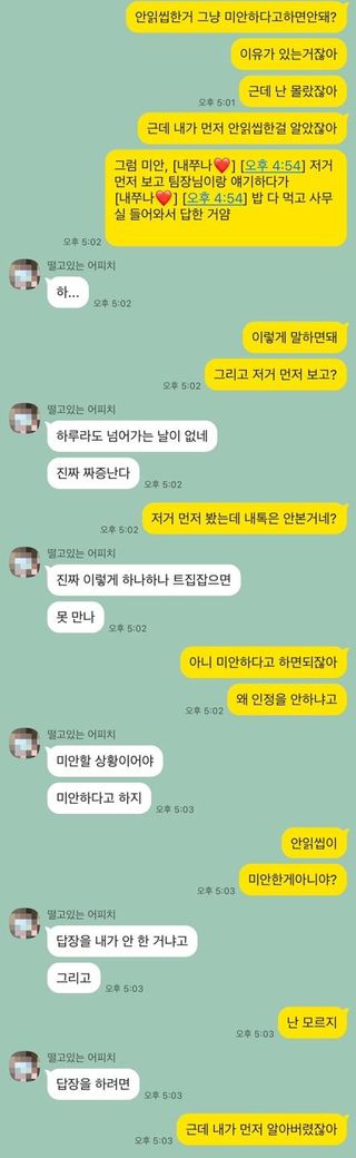 쟤 카톡은 하루종일 기다렸냐 하면서 며칠을 엄청 싸웠거든요