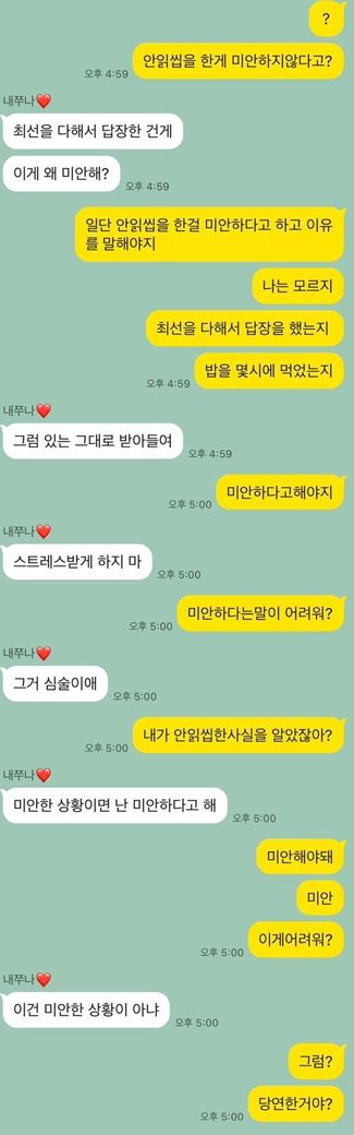 아무리 그래도 진짜 사랑하면 상대가 서운해할 때 미안하다고 할 수 있어야합니다.