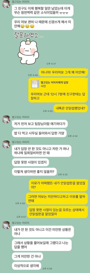 직장도 다니고 연애 초반도 아닌데 항상 여친과의 카톡이 1순위가 될 순 없습니다. 그리고 지인 아는사람 부고소식 알림이 떠서 충격적인 내용이라 먼저 본거고 남친 말대로 상사랑 얘기하다가 사무실 가서 바로 톡했다고 하잖아요..