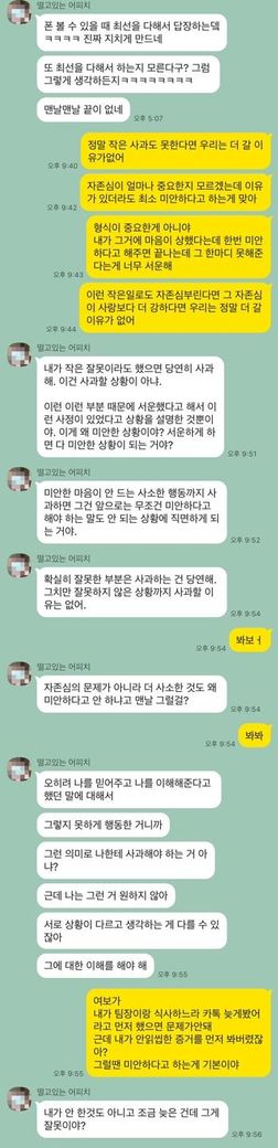 제가 보기에는 질분자님이 좀 많이 예민해보이세요 직장 동료랑 나눈 대화 가지고 남친을 들들 볶는다는건 좀 그래요 말꼬리 잡는것도 그렇구요 정 사과를 받고 싶으시면 얼굴보고 이래서 이랬다 나한테 사과해줄수 있냐? 라고 얘기해야지 남친이 대화를 피하는데 사과를 강요하는건 좀 배려심 없는 행동입니다