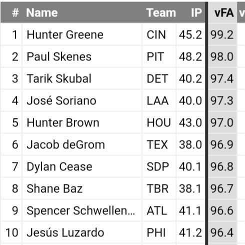 2025년 기준, 메이저리그에서 평균구속이 가장 빠른 투수는 피츠버그 파이리츠의 폴 스키니스입니다. 평균 패스트볼 구속이 약 100마일(161km/h)로, 현역 투수 중 1위입니다. 예전에는 뉴욕 양키스의 아롤디스 채프먼이 유명했지만, 지금은 스키니스가 가장 빠릅니다. 마무리 투수 중에서도 스키니스가 평균구속에서 가장 앞서 있습니다