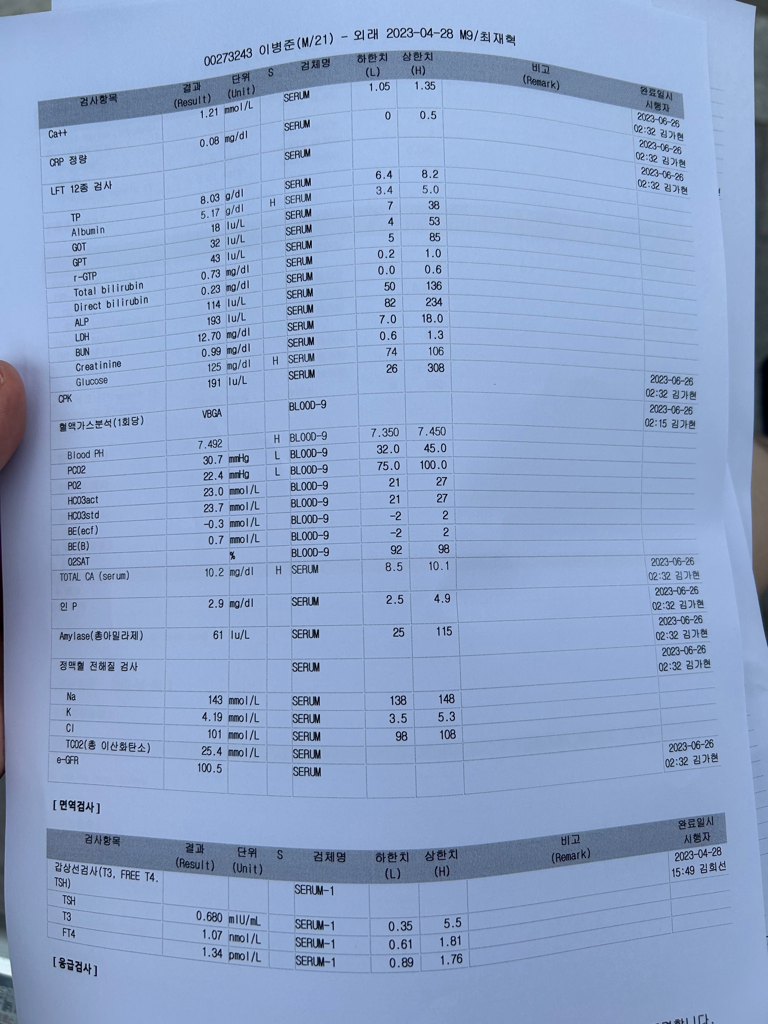6월26일에 응급실에서 검사한 심전도,엑스레이,피검사,응급피검사 정상 이였습니다