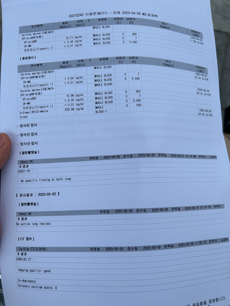5월초 심장CT,심장초음파,피검사,엑스레이,심전도 정상
