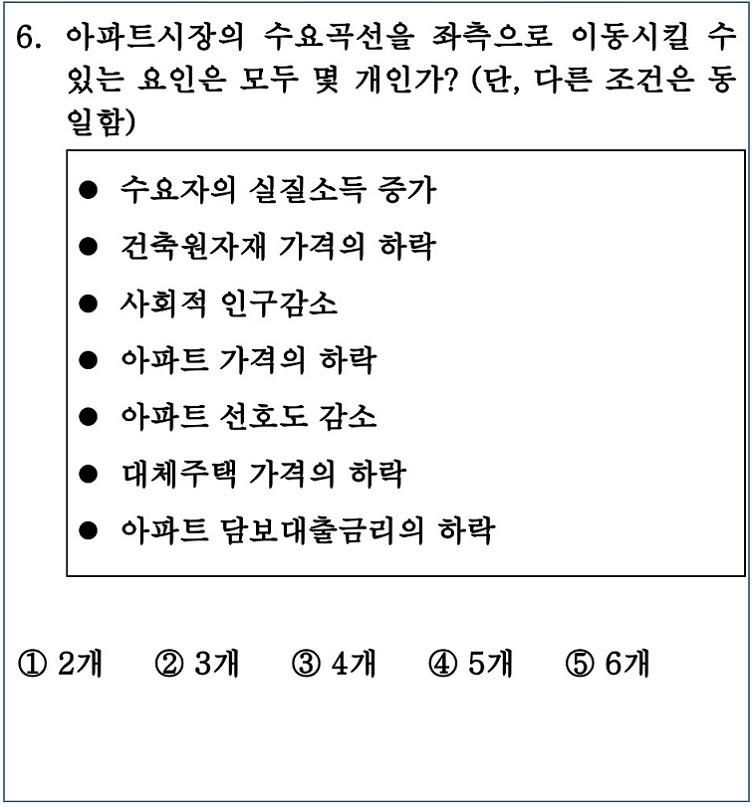 답만 맞은신게 아닌가 싶네요, 일단 답은 3개 2번이 맞습니다만 이에 포함되는 부분은 사회적인구감소, 아파트선호도 감소, 대체주택의 가격하락이 포함됩니다.