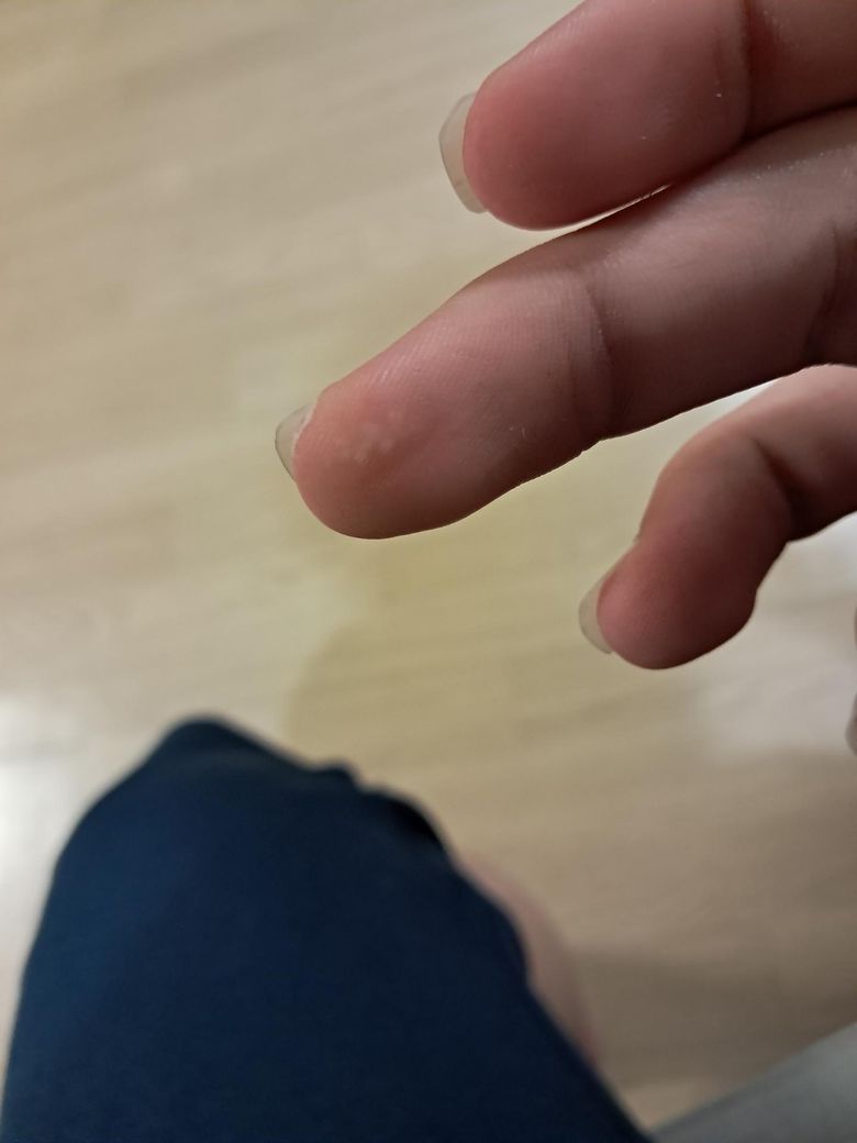 가운데 손가락 부분인데요. 이 부분은 2주전?에 화상 입어서 피부가 하얬던 부분입니다. 하얀 부분이 사라졌길래 밴드를 떼고 다녔는데 지금 보니 이렇게 색은 정상적이지만 잘 보면 안에 하얀 물질이 있습니다. 이게 뭘까요? 아니면 자연스러운 회복 과정일까요?